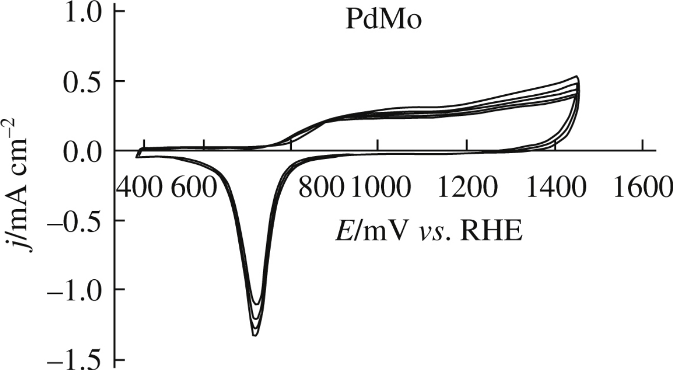 The PdMo (∼20 at% Mo) deposits obtained by electrodeposition from acetate solutions containing a palladium salt and ammonium heptamolybdate on the surface of a glassy carbon electrode demonstrated low palladium solubility at high anodic potentials.