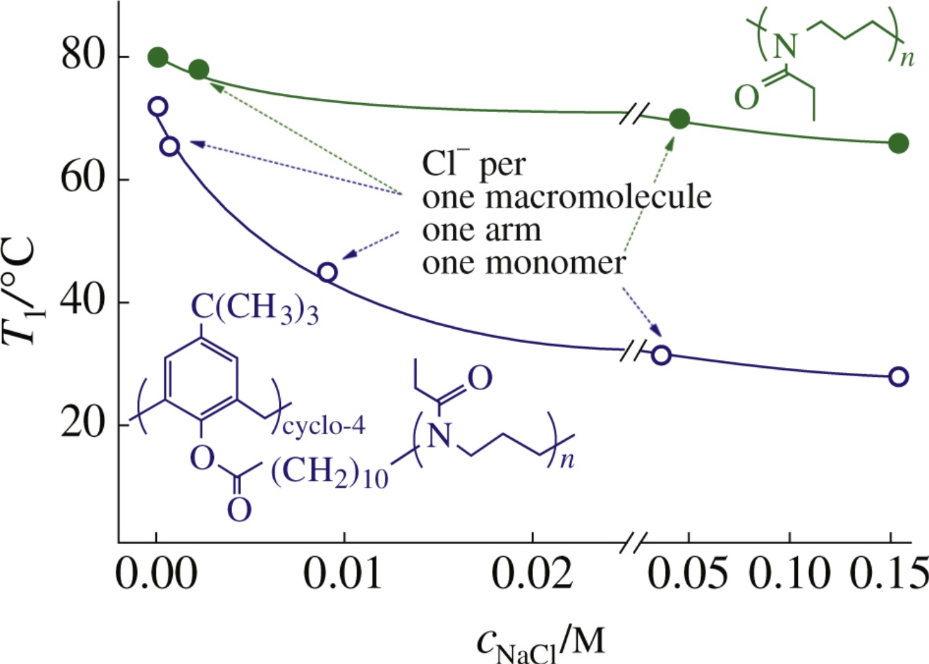 Linear and calix[4]arene based star-shaped poly-2-ethyl-2-oxazines have been explored in saline solutions at NaCl concentration of 0.0050gcm−3. The calix[4]arene core promotes an aggregation in solutions of the star-shaped polymer and a decrease in its phase separation temperature. Poly-2-ethyl-2-oxazine is more sensitive to the presence of NaCl in solution than the known poly-2-isopropyl-2-oxazolines.