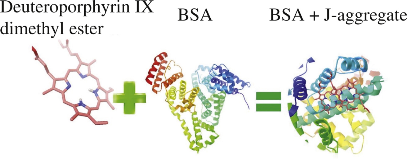 In water–DMF at DMF content less than 2.6moldm−3, deuteroporphyrin IX dimethyl ester forms both H- and J-aggregates. The J-aggregates are detected as a single type of associated species after binding of the porphyrin with BSA on the surface of the protein IB subdomain.