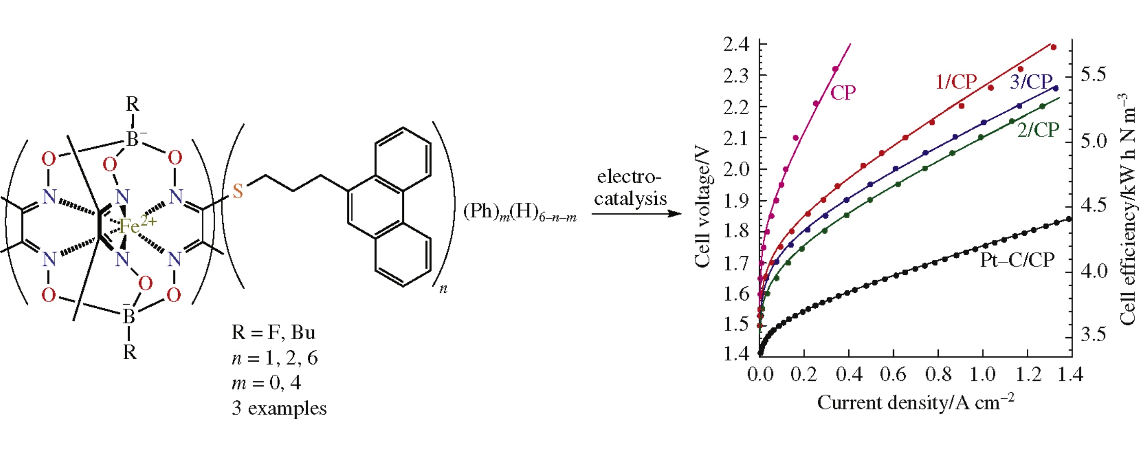 Hydrogen-evolving cathodes were prepared using a series of iron(ii) clathrochelates bearing various number of terminal phenanthrenyl groups via physisorption on carbon paper and employed in the polymer electrolyte membrane water electrolysis cells instead of typically used platinum. In situ electrochemical activation of the cathodes was carried out, after that the cells performance and durability were evaluated. These clathrochelate complexes represent a promising alternative to platinum as hydrogen-evolving cathode electrocatalysts.