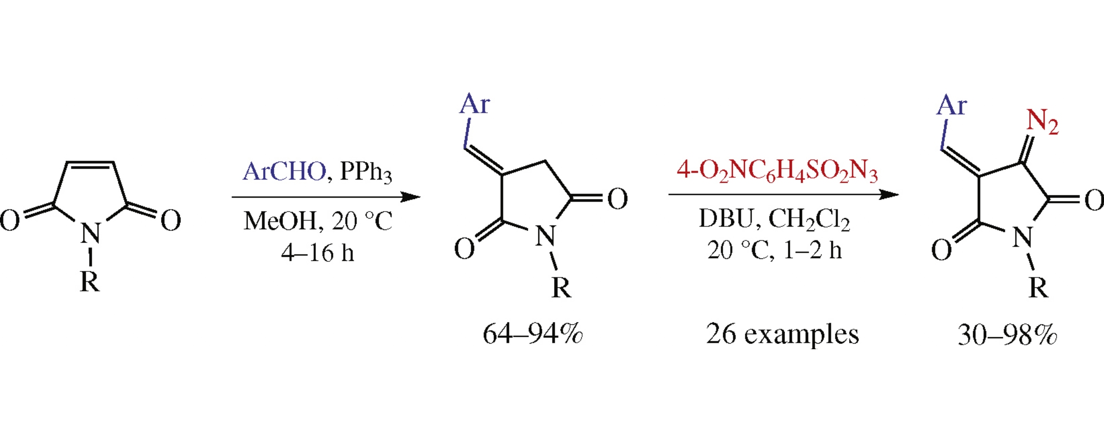A practically convenient synthesis of (E)-3-arylidene-4-diazopyrrolidine-2,5-diones from N-substituted maleimides via the Wittig reaction and the Regitz diazo transfer has been developed. In all 26 cases studied, only one chromatographic purification was required with no need for aqueous workup, which makes this protocol amenable to producing the emerging class of diazo compounds in parallel format.