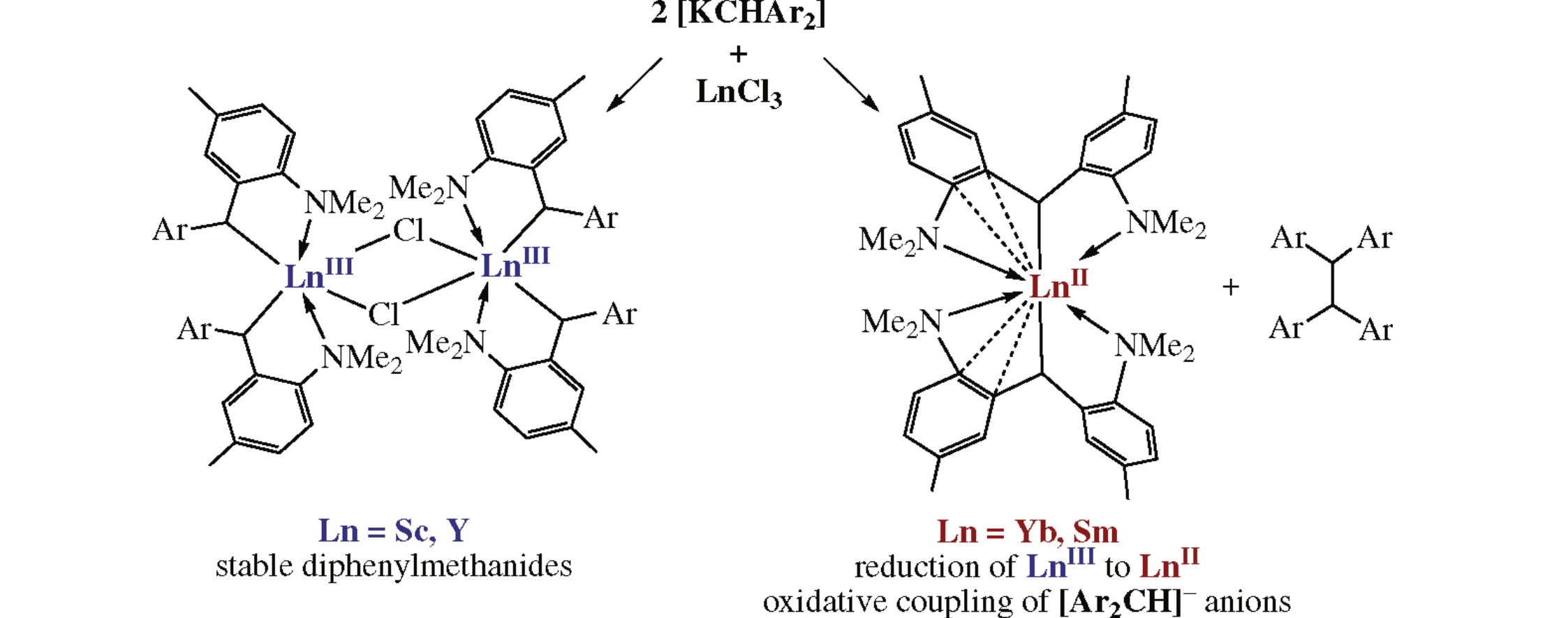 The outcome of salt metathesis reactions between the equimolar amounts of LnCl3 and dimeric potassium diphenylmethanide {[2,2′-(4-MeC6H3NMe2)2CH]K(THF)}2 depends on the rare-earth metal ion. In the case of ScIII and YIII, the reactions afford chlorido-bis(diphenylmethanido) complexes {[2,2′-(4-MeC6H3NMe2)2CH]2LnIII(μ-Cl)}2, in which the diphenylmethanido ligands perform bidentate κ2-CN coordination according to the X-ray data. For YbIII and SmIII, these reactions result in the spontaneous reduction of LnIII to LnII and the formation of known bis(diphenylmethanido) complexes [2,2′-(4-MeC6H3NMe2)2CH]2LnII and the product of oxidative coupling of diphenylmethanido anions.