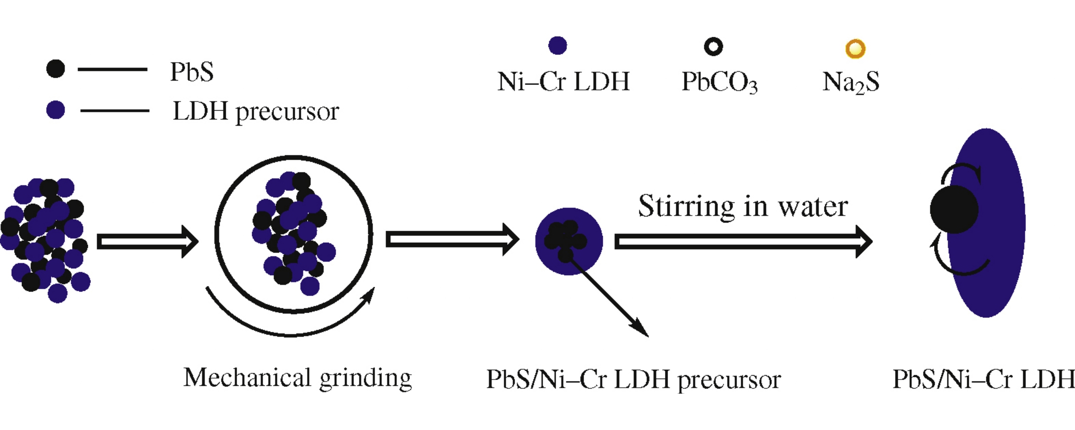 The synthesis of lead(II) sulfide nanocomposite based on nickel–chromium layered double hydroxide was accomplished by the mechanochemical method at room temperature. The obtained nanocomposites were characterized by powder X-ray diffraction, UV-VIS spectroscopy, scanning electron microscopy and energy-dispersive X-ray spectroscopy to estimate structural, optical and morphological properties. The PbS nanoparticles expanded the interlayer space of the layered double hydroxide, its crystal structure was destroyed, and the PbS nanoparticles attached to the surface affected the XRD result.