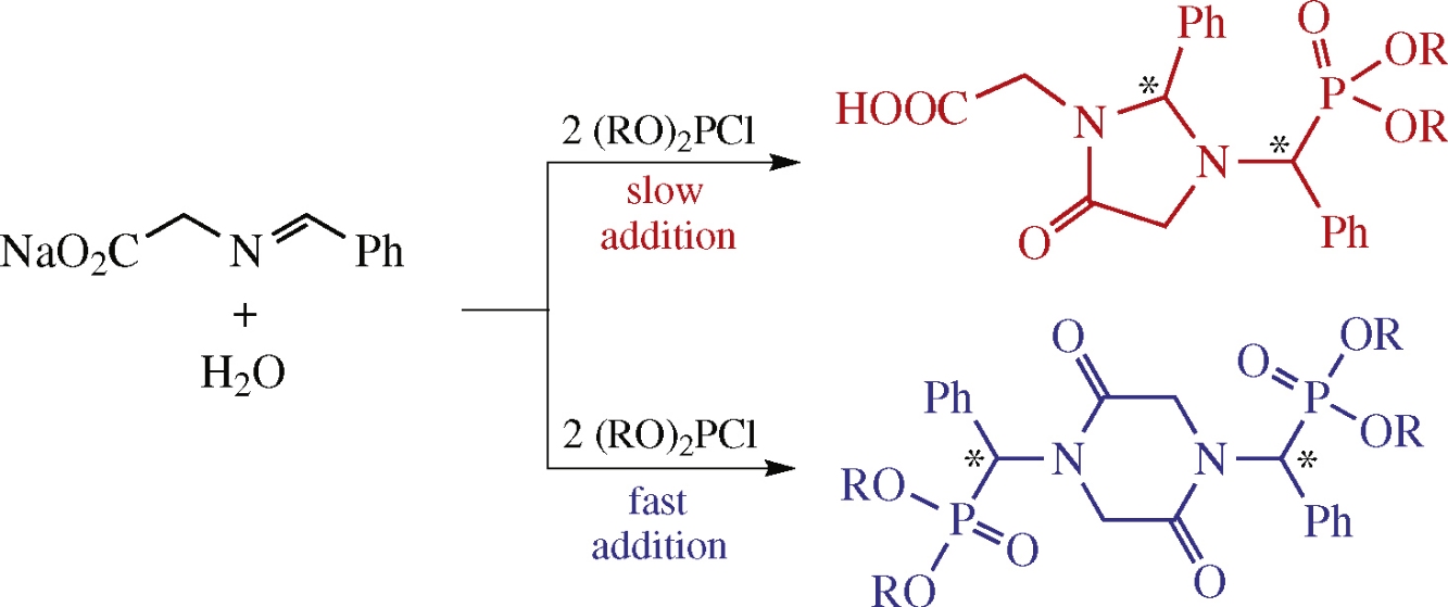 The outcome of reaction of sodium N-benzylideneglycinate containing water in its crystal lattice with dialkyl chlorophosphites depends on the mode of addition of the latter. Upon the simultaneous mixing of the reactants, 1,4-bis[α-(dialkoxyphosphoryl)benzyl]piperazine-2,5-diones are formed from two molecules of each reactant. With the slow addition of dialkyl chlorophosphite, the main reaction product is 2-{3-[α-(dialkoxyphosphoryl)benzyl]-5-oxo-2-phenylimidazolidin-1-yl}acetic acid (‘1: 2 adduct’), its formation comprising 1,4-migration of dialkoxyphosphoryl moiety.