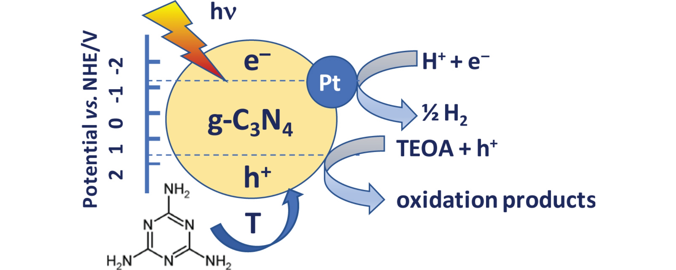 The optimal conditions for the synthesis of platinized graphitic carbon nitride (Pt/g-C3N4) have been found. It was investigated as a catalyst for the production of hydrogen from aqueous solutions of triethanolamine (TEOA) under irradiation with visible light. The highest photocatalytic activity of 450μmolh−1g−1 and an apparent quantum efficiency of 1.1% were demonstrated by the 1% Pt/g-C3N4 sample prepared from melamine by calcining at 600°C for 2h.