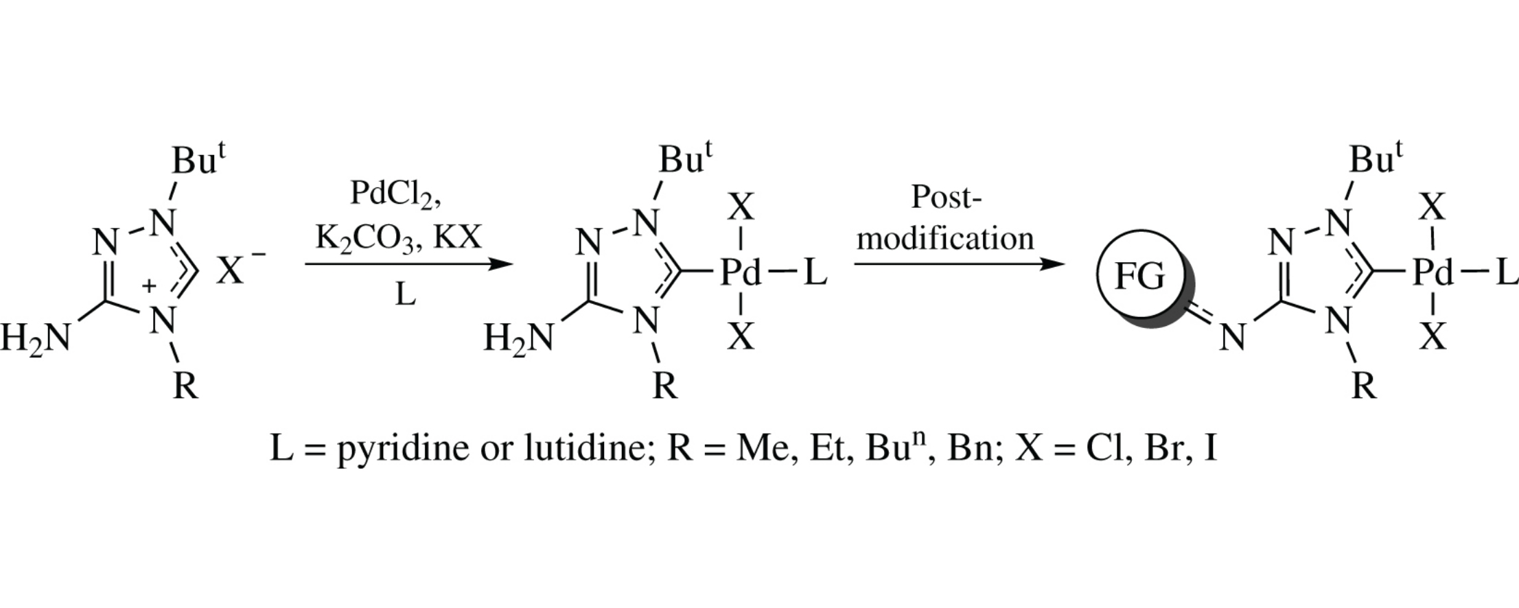 Palladium complexes with N-heterocyclic carbene ligands of a new type containing free NH2 group were obtained by direct palladation of 3-amino-1,4-dialkyl-1,2,4-triazolium salts. These amino-functionalized complexes were found to be a versatile platform for postmodification via reactions of the NH2 group with acyl and sulfonyl chlorides.