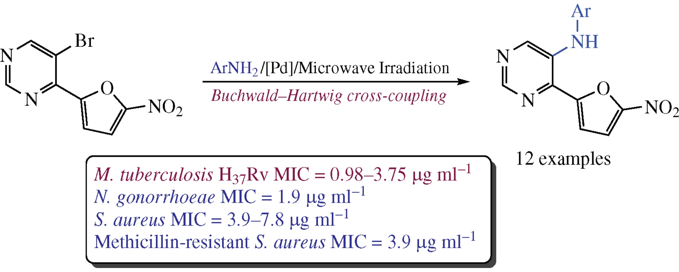 The Buchwald–Hartwig cross-coupling of 5-bromo-4-(furan-2-yl)pyrimidine with various anilines afforded the corresponding new 5-(arylamino)pyrimidines, the reaction being accelerated by microwave irradiation. Most of the obtained compounds proved to possess a high bacteriostatic in vitro effect against Mycobacterium tuberculosis H37Rv, Neisseria gonorrhoeae, and Staphylococcus aureus including Methicillin-resistant strain, which is stronger than that of the commercial drug Spectinomycin.