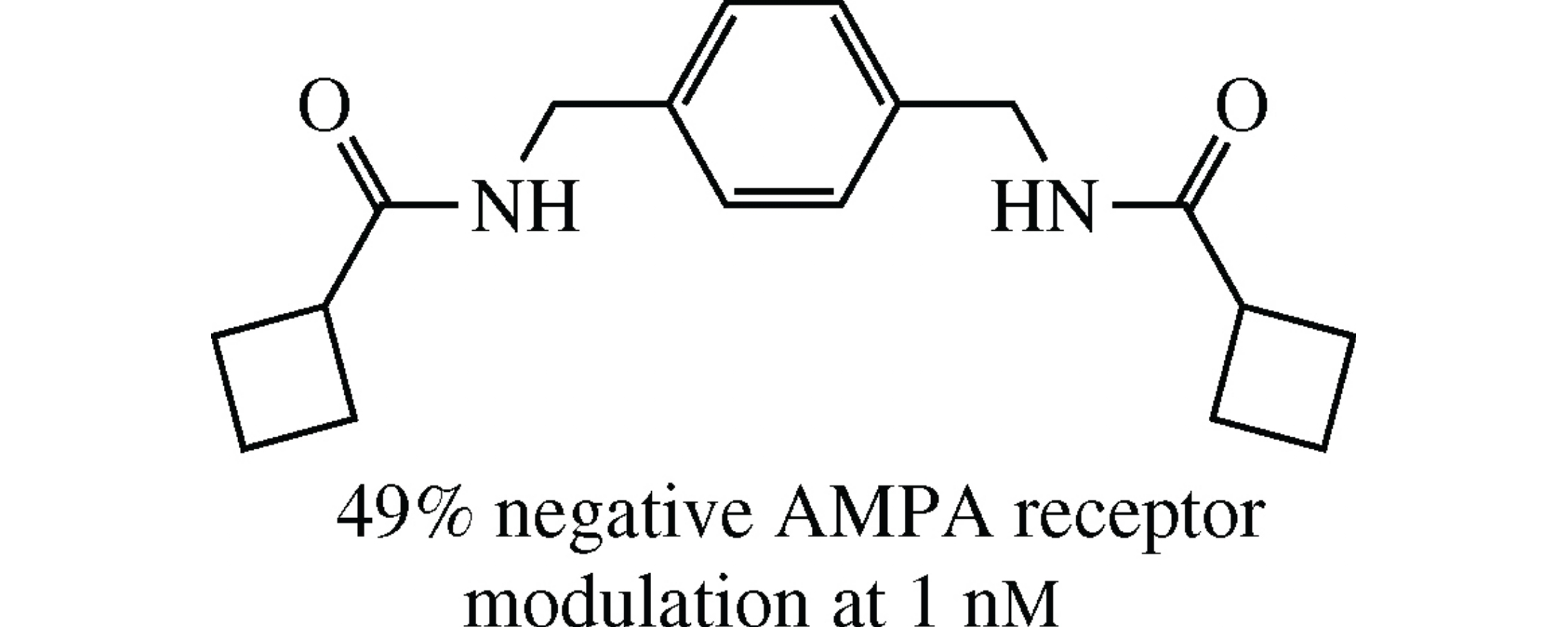 Bisamides of 1,4-bis(aminomethyl)benzene with cyclopropane-, cyclobutane- and cyclopentanecarboxylic acids reveal the negative modulation of kainate-induced currents in rat Purkinje neurons observed using patch clamp technique. The most pronounced effect has been found for the bisamide of cyclobutanecarboxylic acid, which blocks the currents by 41 and 49% at concentrations of 1×10−10 and 1×10−9moldm−3, respectively.