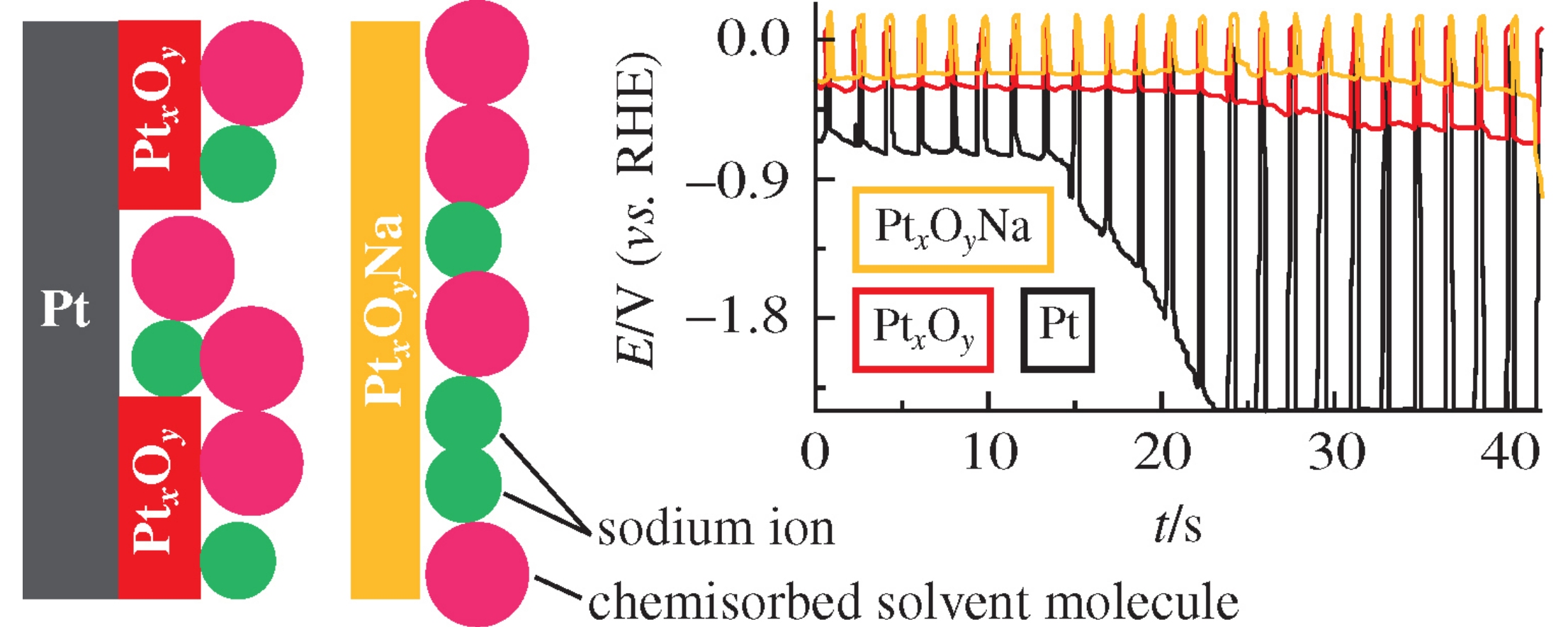 The cathodic polarization of platinum in both aqueous and nonaqueous alkali metal ion electrolytes includes electrochemical adsorption of solvent molecules as well as intercalation of the alkali metal ions into an adsorption layer. The intercalation into oxidized platinum surface proceeds more effective compared with pure platinum.