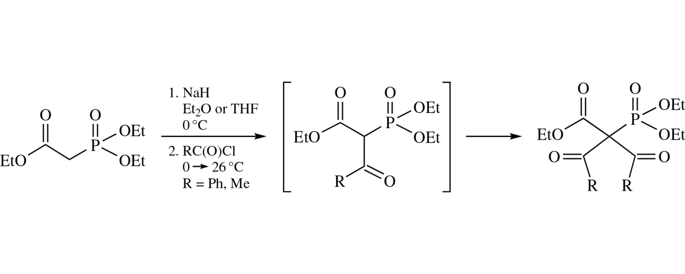 Deprotonation of diethyl (ethoxycarbonylmethyl)-phosphonate with NaH followed by treatment with acyl chlorides affords surprisingly the corresponding C,C-diacylated derivatives as the predominating products.