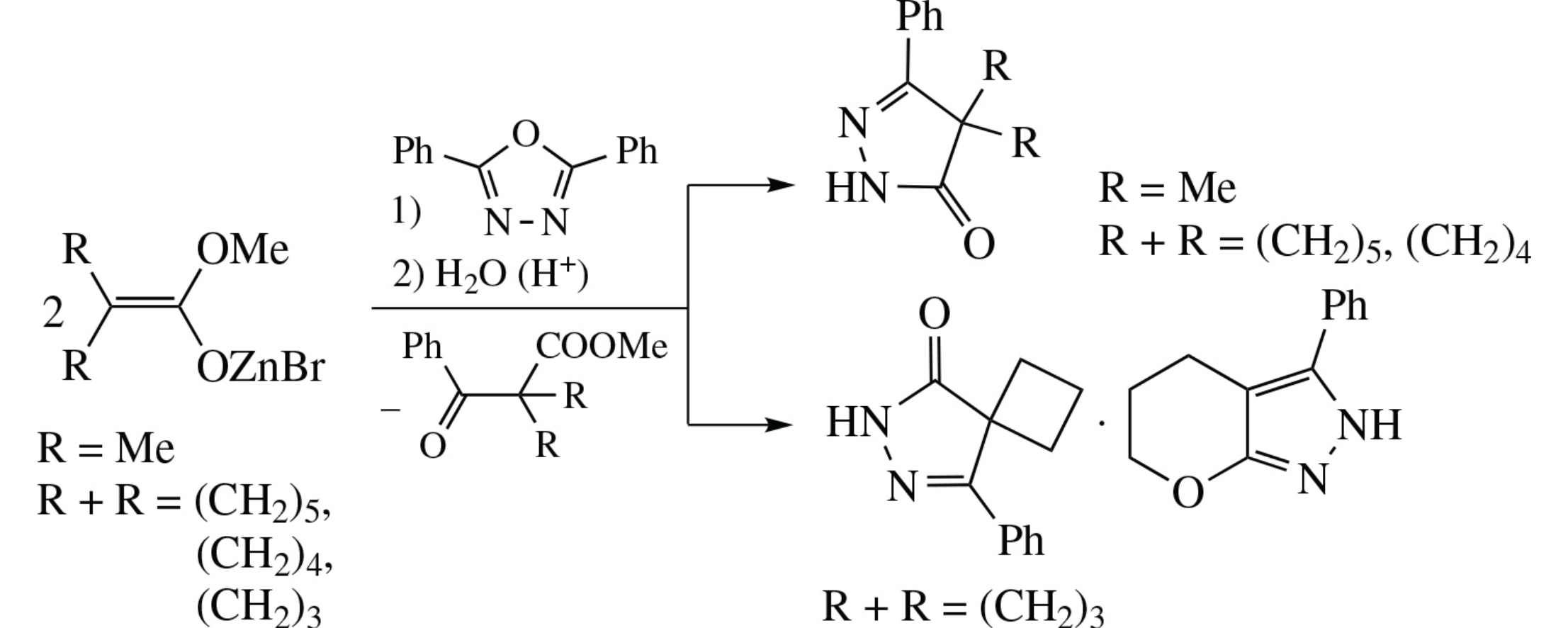 The reaction of methyl a-bromoisobutyrate or 1-bromocycloalkanecarboxylates with zinc and 2,5-diphenyl-1,3,4-oxadiazole leads to 5-phenyl-2,4-dihydro-3H-pyrazol-3-one derivatives, with the cycloalkane series affording products of spiro structure. In the case of cyclobutane reactant, 3-phenyl-2,4,5,6-tetrahydropyrano[2,3-c]pyrazole is also formed.
