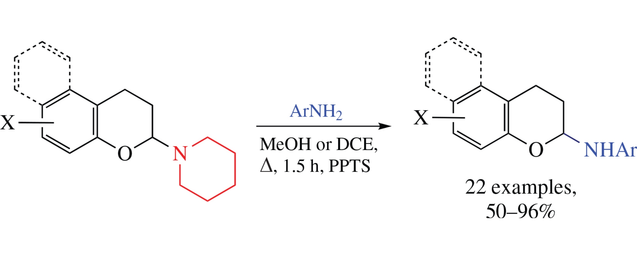 Reaction between 2-piperidinochromane and (hetero)aromatic amines in the presence of pyridinium tosylate affords the products of replacement of the piperidine fragment by the (hetero)arylamino moiety in good yields. This single-stage process opens facile and efficient way to the functionalized N-arylchroman-2-amines.