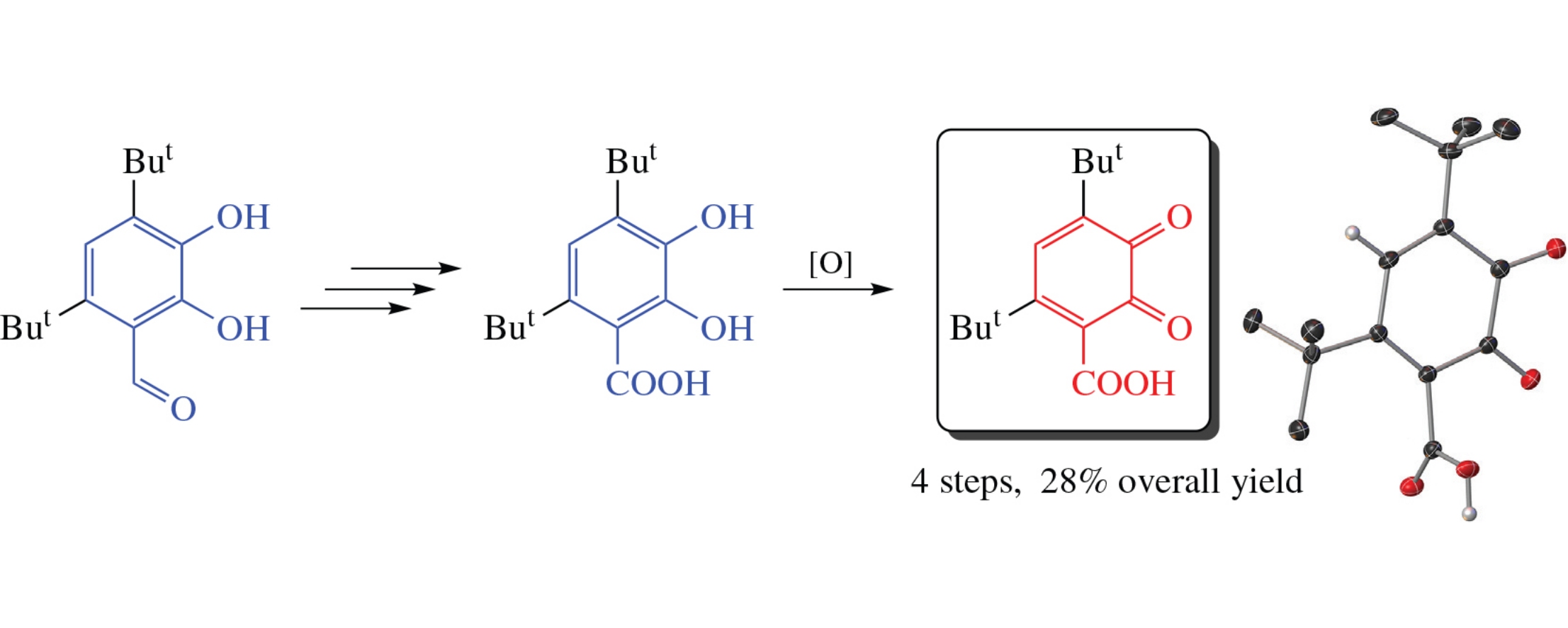 2,4-Di-tert-butyl-5,6-dioxocyclohexa-1,3-diene-1-carboxylic acid, an oxidized analogue of sterically hindered pyrocatechuic acid, was obtained from 4,6-di-tert-butyl-2,3-dihydroxybenzaldehyde in four stages. The electrochemical reduction of this compound proceeds in two stages: the first reduction wave (Ered1=−0.24V) is irreversible, while the second stage is partially reversible (E1/2, red2=−0.65V). The molecular structure of the o-quinone carboxylic acid in the crystalline state was comfirmed by single-crystal X-ray analysis.