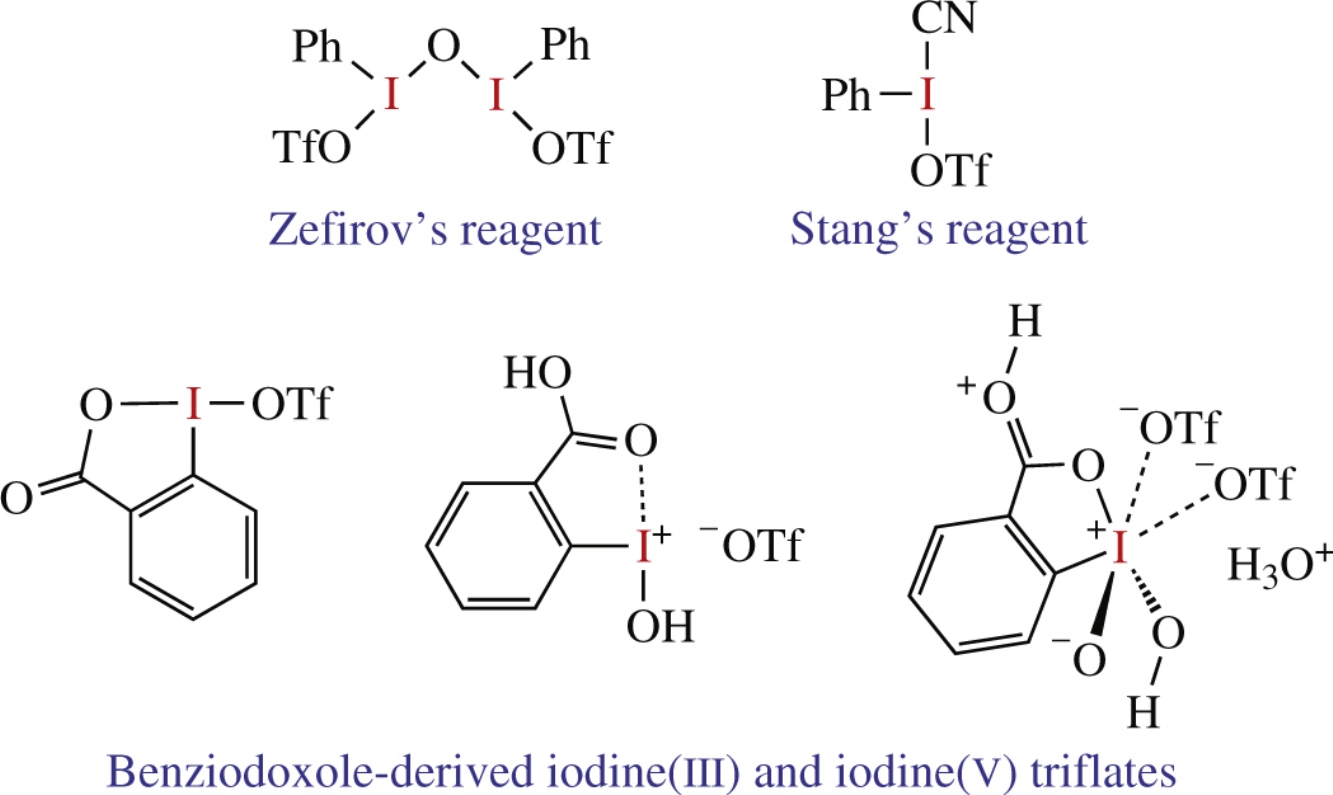 This minireview describes chemistry of hypervalent organoiodine triflates, which have received wide synthetic application as powerful electrophilic reagents and oxidants. The first representative of these compounds, μ-oxo-bis[(trifluoromethanesulfonato)(phenyl)iodine], was originally prepared and investigated in N. S. Zefirov's laboratory at Moscow State University in the early 1980s. This compound, now commonly known as Zefirov's reagent, is a useful reagent for the synthesis of various iodonium salts from the corresponding organic precursors. Recently, thermally stable and highly reactive triflates derived from cyclic hypervalent iodine compounds, benziodoxoles, have been reported and utilized in organic synthesis. The strongest iodine(V) oxidant, IBX-ditriflate, has been prepared from 2-iodoxybenzoic acid (IBX) and triflic acid. IBX-ditriflate can readily oxidize organic substrates that are generally resistant to oxidation.