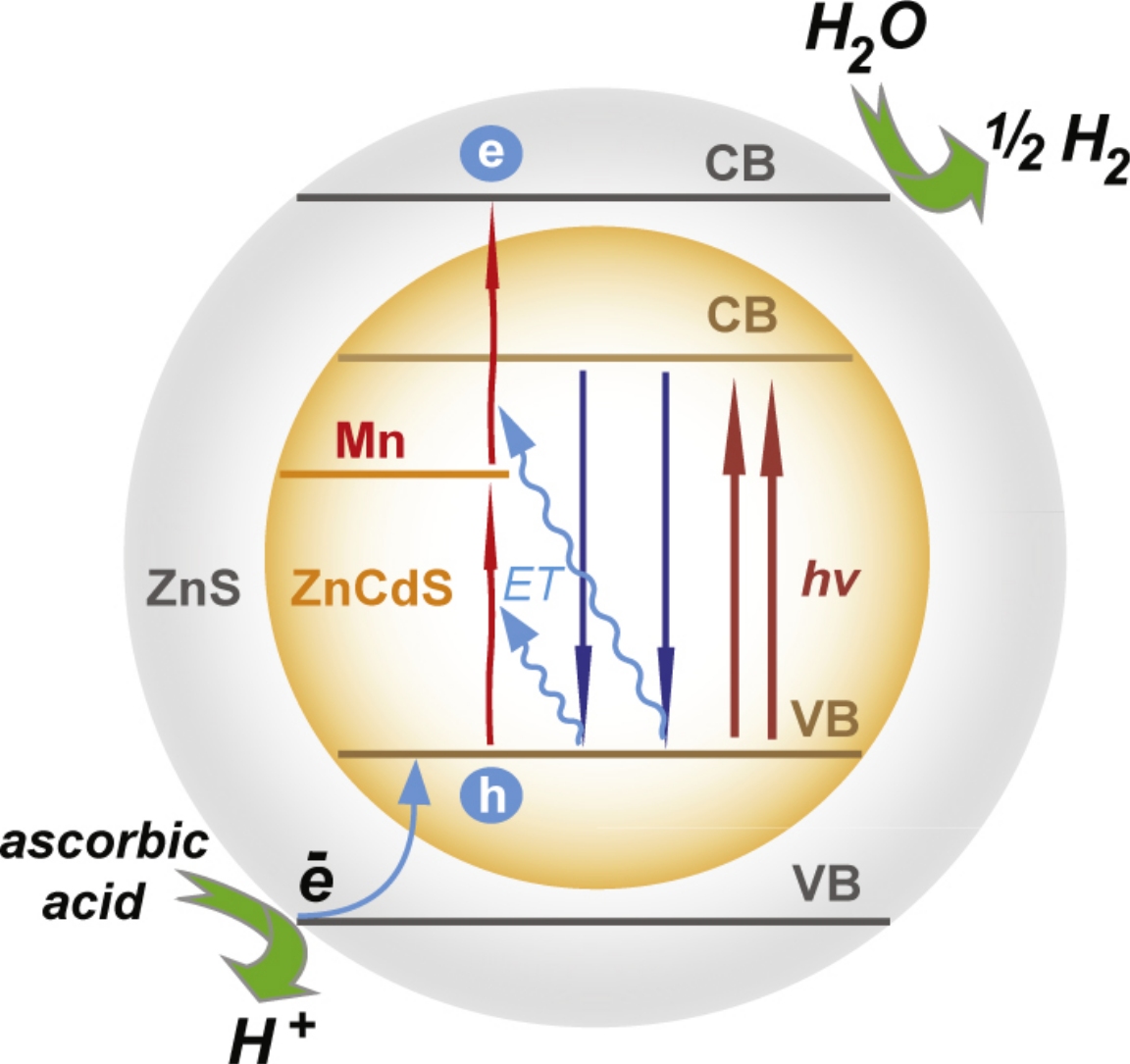 The effect of doping of the ZnxCd1−xS (x=0.37–0.50) alloy nanocrystals with Mn2+ ions on the rate and apparent quantum yield of the photocatalytic H2 evolution catalyzed by this alloy has been investigated. It has been found that the ZnS shell significantly increases the lifetime of the Mn2+ excited state, which leads to the generation of ‘hot’ electrons and the two-photon photocatalytic reduction of hydrogen ions. An analysis of the characteristics of nanocrystals without a ZnS shell with similar excitation energies of the edge exciton revealed that the efficiency of the alloy doped with Mn2+ ions is 1.2–1.3 times higher due to an increase in the lifetime of photoinduced electron–hole pairs.