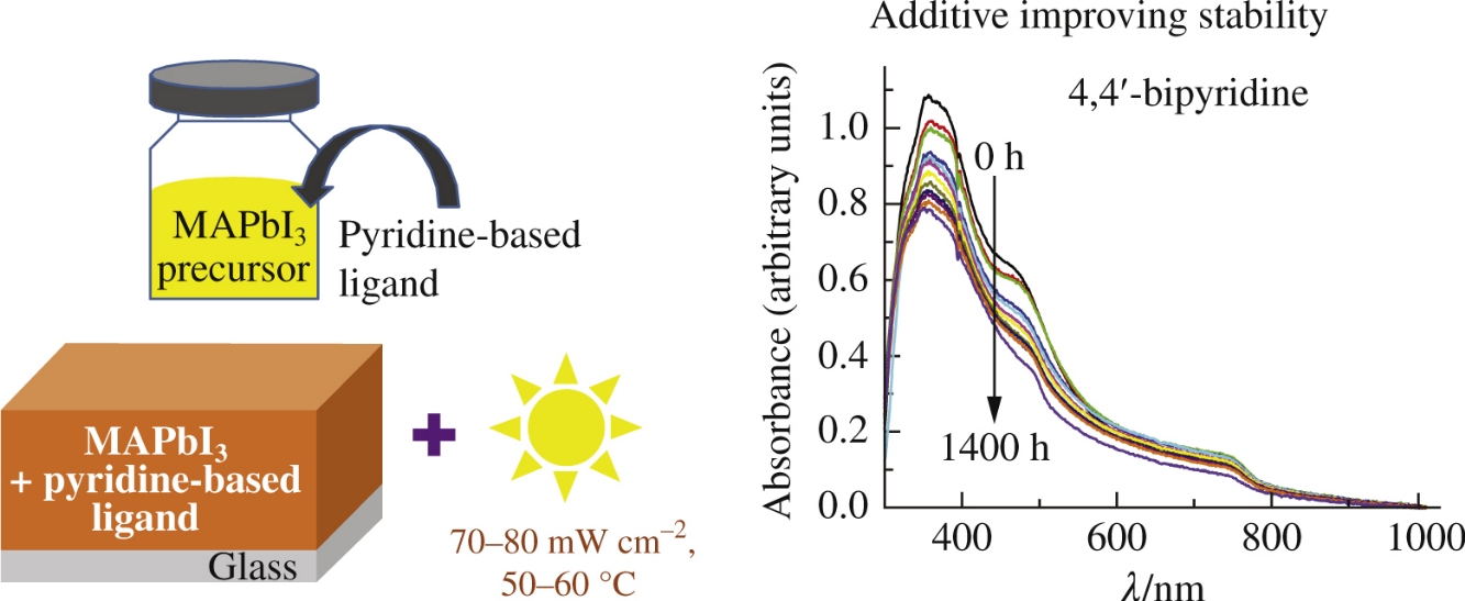 The effect of pyridine-based ligands, capable of coordinating e improving stability with Pb2+ defect sites through nitrogen atoms, on the photostability of MAPbI3 thin films under solar radiation of 70–80mWcm−2 at 50–60°C in an inert atmosphere has been investigated using UV-VIS spectroscopy, X-ray diffraction analysis and atomic force microscopy. It has been found that the addition of 4,4′-bipyridine to the perovskite precursor improves the photostability of a MAPbI3 thin film, withstanding illumination for 1400h.