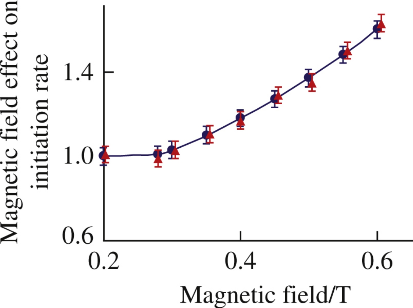 The effect of a constant magnetic field on the initiation of chain oxidation at 343K in the presence of azo initiators increases with an increase in the magnetic field strength in the range of 0.3–0.6T and does not depend on the nature of the oxidized compound and solvent. In the case of a peroxide initiator, no magnetic field effect is observed. For azo initiators, the probability of S–T+ and S–T− transitions in the singlet pair [r• •r] increases, thereby enhancing the efficiency of the release of radicals from the cell.