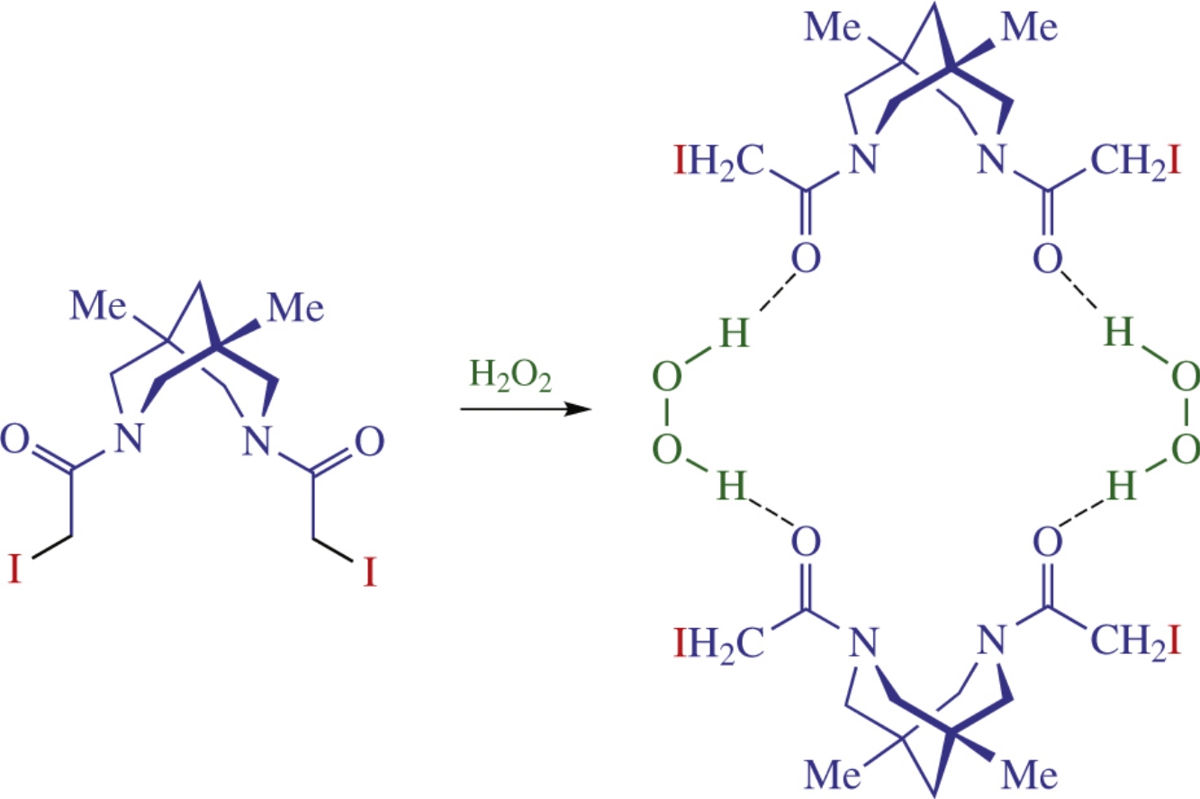 Six new bispidine-based bis-amides containing residues of haloacetic acids were synthesized and characterized by X-ray crystallography. The dissolution of iodine-containing compound in concentrated hydrogen peroxide afforded bispidine peroxosolvate, in which the peroxide molecules participated in two donor hydrogen bonds with carbonyl oxygen atoms of the distinct adjacent organic molecules thus forming cyclic motifs in crystals. This structure is a first example of peroxosolvate of iodine-containing organic molecule.