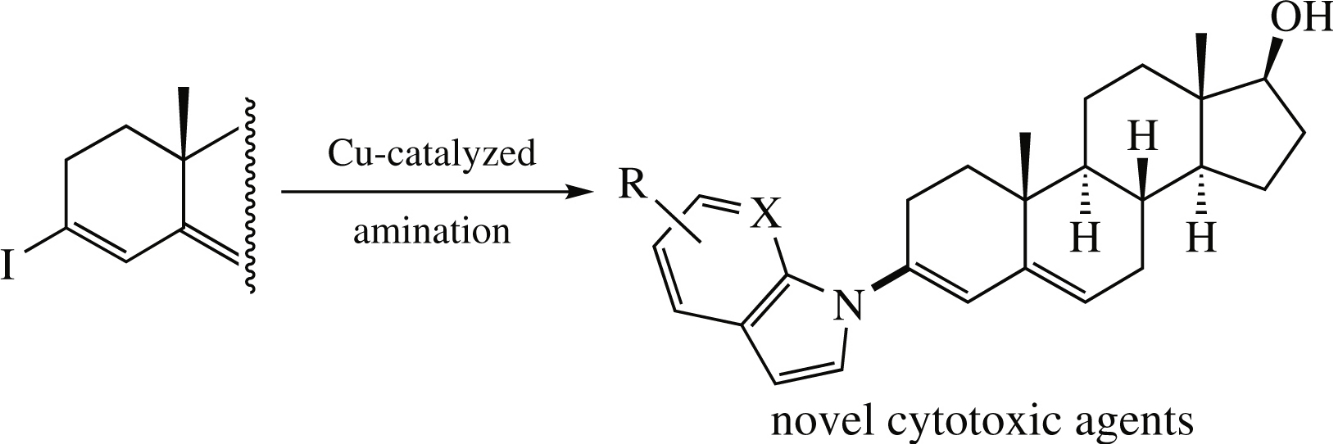 A series of novel 3-azolylandrosta-3,5-dienes was prepared via Cu-catalyzed Ullmann C–N coupling between a readily available steroidal vinyliodide and a variety of NH-heterocycles. The cytotoxic activity of the target compounds was evaluated against selected cancer cell lines (MCF-7, SKOV-3, DU-145, PC-3). Compound bearing gramine fragment showed the highest antiproliferative effect with IC50 values in the range of 2.0–10.1μm.