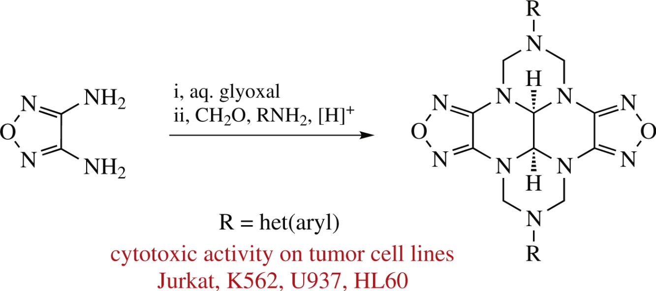 New 2,8-di(het)aryl-containing dioxadecaazadicyclopenta[e,l]pyrenes, furazan-annulated polyaza polycycles, have been synthesized by acid-catalyzed cyclocondensation of difurazanotetraazadecalin with formaldehyde and primary (het)arylamines. The cytotoxic activity of these compounds against tumor cell lines (Jurkat, K562, U937, HL60) has been estimated.