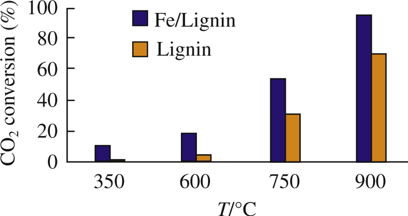 Dry reforming of lignin was carried out in the presence of a catalytic amount of iron introduced into lignin by impregnation with a solution of iron(III) nitrate. Organic products with low molecular weight have been obtained at lower temperatures, including aromatic, aliphatic and phenolic compounds.