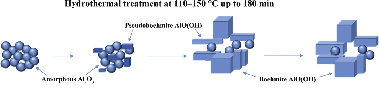 Amorphous Al2O3 transforms into the pseudoboehmite and boehmite phases of AlO(OH) under hydrothermal conditions. Specific surface area, pore volume and the amount of acidic sites decrease upon complete conversion of amorphous Al2O3 into boehmite.