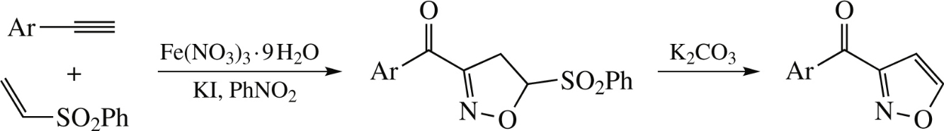 Iron(III) nitrate-assisted cycloaddition of (phenylsulfonyl)ethene to arylacetylenes in the presence of KI affords 5-phenylsulfonyl-3-aroylisoxazolines whose treatment with K2CO3 provides 4,5-unsubstituted 3-aroylisoxazoles. Both synthetic steps can be performed in a one-pot manner.