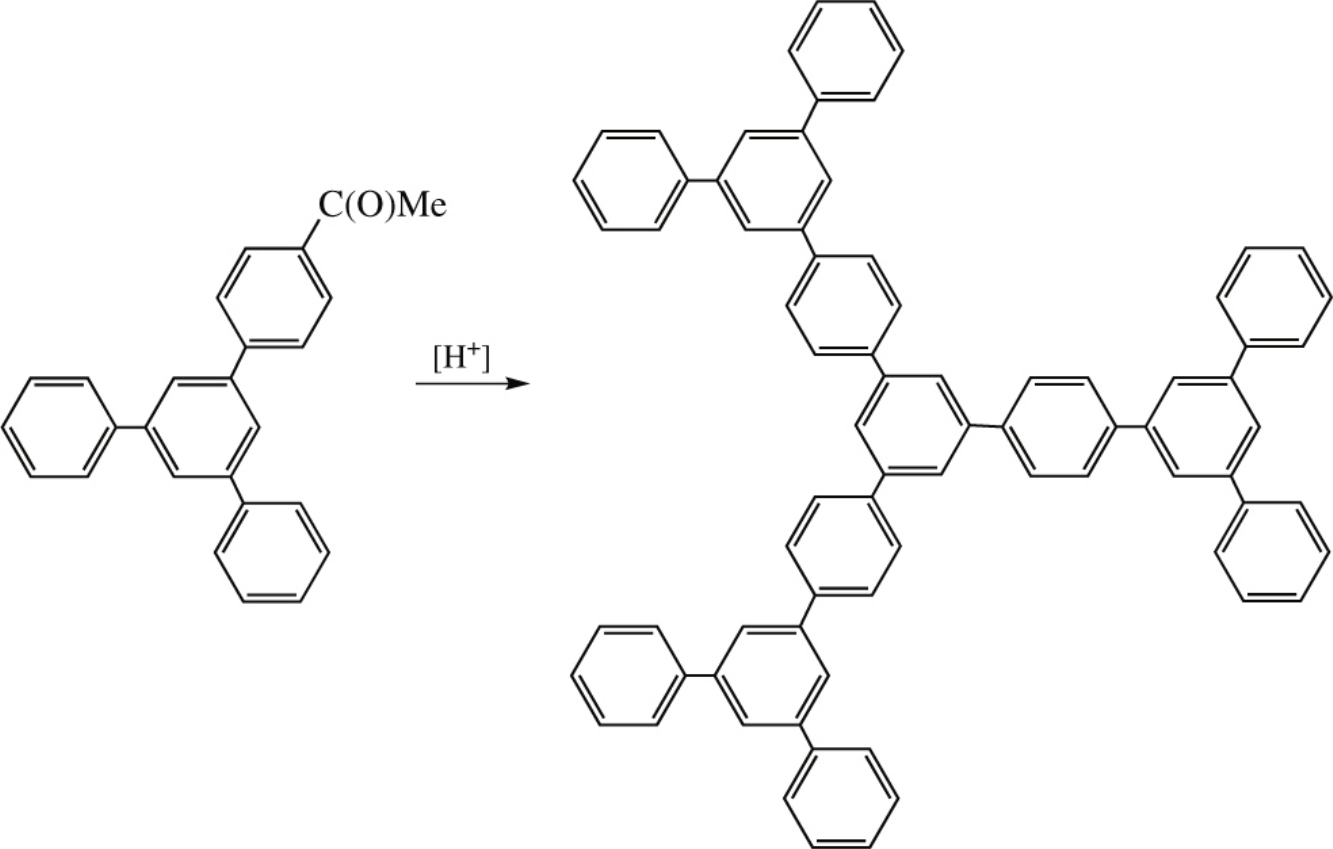 A second generation phenylene dendrimer, viz. 1,3,5-tris[4-(3,5-diphenylphenyl)phenyl]benzene, was synthesized by cyclocondensation of 4-acetyl-3′,5′-diphenyl(biphenyl). This compound on heating to 600°C is transformed into substance possessing extremely heat-stable secondary structure. It retains the aromatic structure at this temperature and when heated to 1000°C is converted into material with graphite-like structure.
