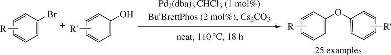 A new solvent-free procedure for C–O cross-coupling between phenols and aryl bromides comprising of Pd2(dba)3/ButBrettPhos catalytic system is efficient for substrates bearing donor or acceptor, as well as bulky substituents.