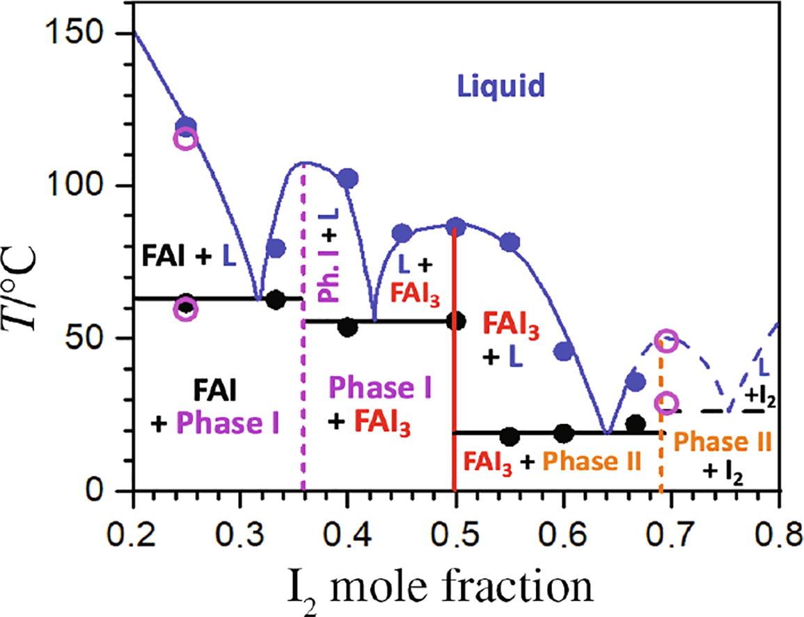 It has been demonstrated that formamidinium–cesium polyiodides are facile reagents for converting metallic lead into perovskite at temperatures of 20–90 °C. For the first time, a tentative phase diagram of the [HC(NH2)2]I–I2 binary system was proposed, and sub- and supersolidus phase relations in the [HC(NH2)2]I–CsI–I2 ternary system were discussed.