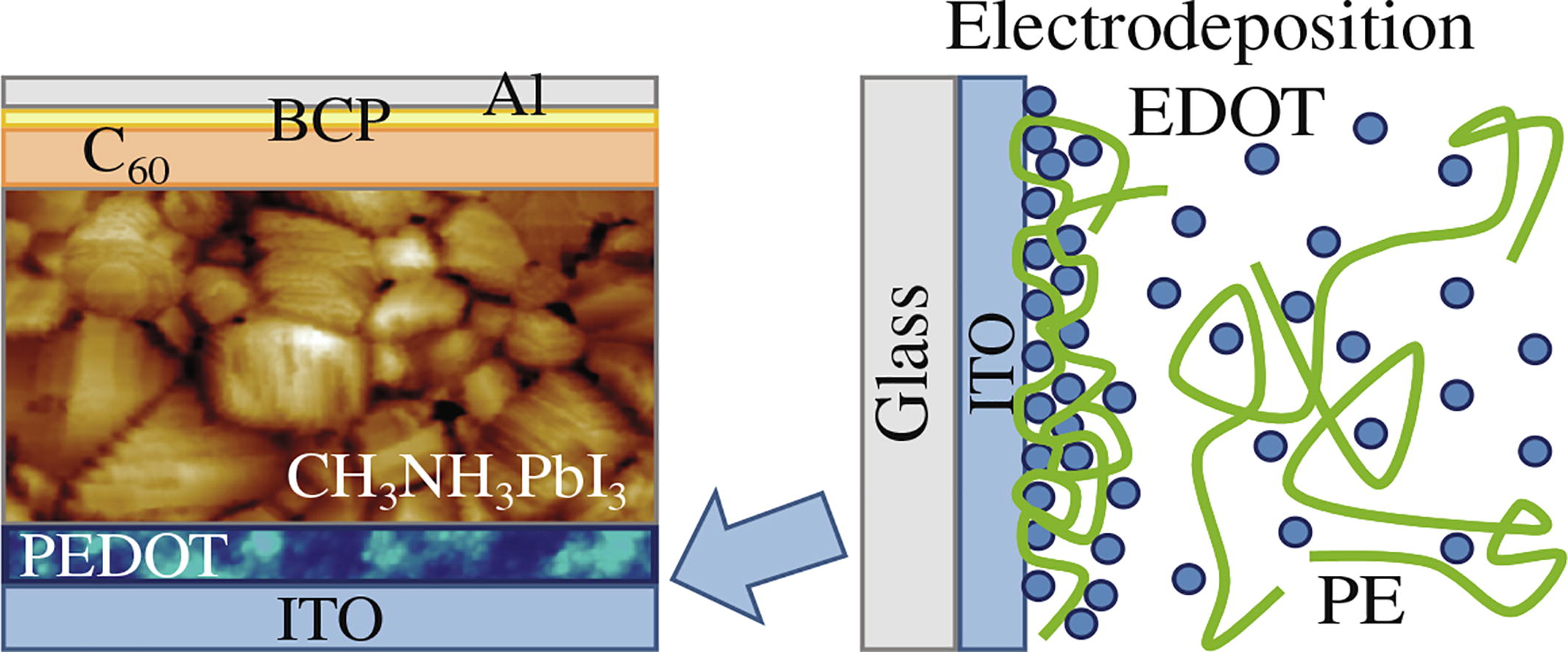 Thin layers of poly(3,4-ethylenedioxythiophene) complexes with various sulfonated polyelectrolytes were formed electrochemically in a galvanostatic regime. These transparent hole transport layers were used in CH3NH3PbI3 perovskite solar cells and the influence of the polyelectrolyte structure on the device performance was featured.