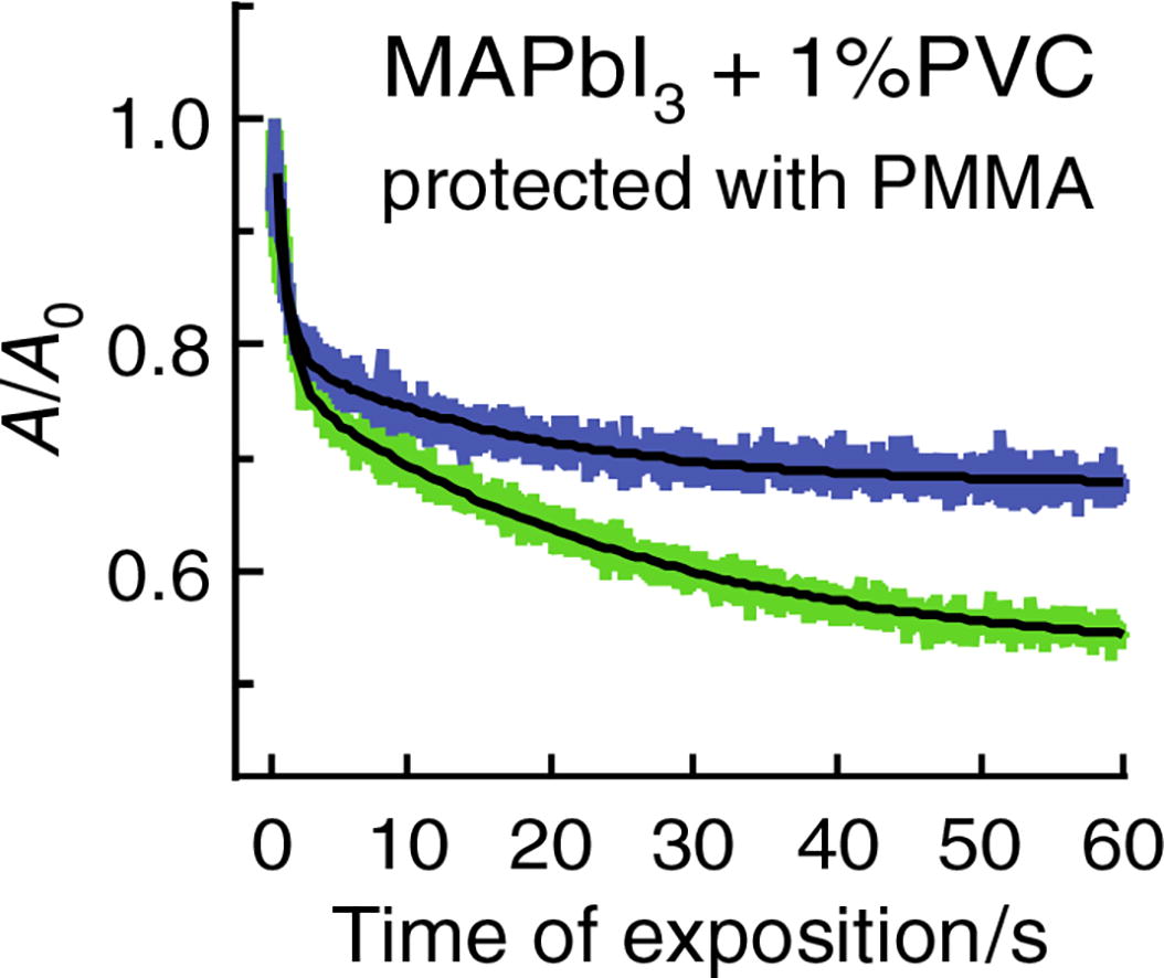 The thin MAPbI3 and MA0.15FA0.75Cs0.1PbI3 perovskite films have strong nonlinear absorption with coefficients of 443 ± 20 and 830 ± 50 cm GW–1, respectively, due to two-photon absorption at 1064 nm. The photochemical degradation of perovskite films was observed upon irradiation with femtosecond pulses at 532 nm, and the depth of photodegradation decreased in perovskite films protected with a PMMA polymer layer.