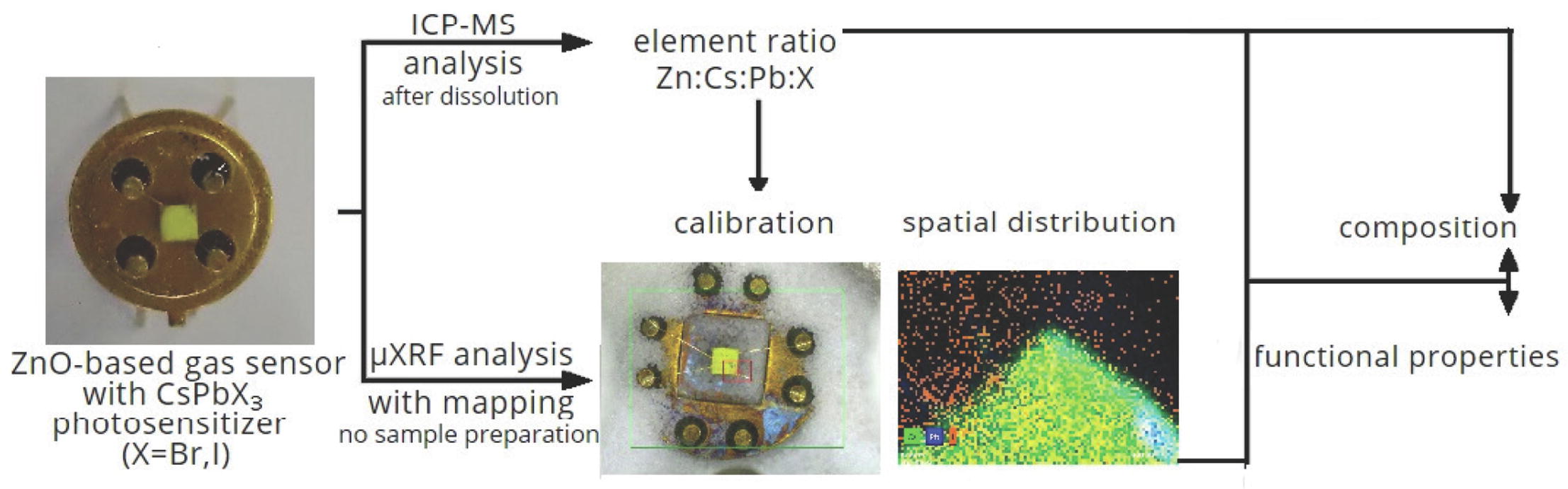 A new approach to in situ analysis of the composition of photosensitive metal halide perovskite-based materials for gas sensor has been developed. The concentration of Cs, Pb, Br and I in the ZnO layer was determined by in situ micro X-ray fluorescence method using inductively coupled plasma mass spectrometry for calibration. The relationship ‘synthesis conditions–composition–photoresponse’ of the sensor has been established based on the results obtained.