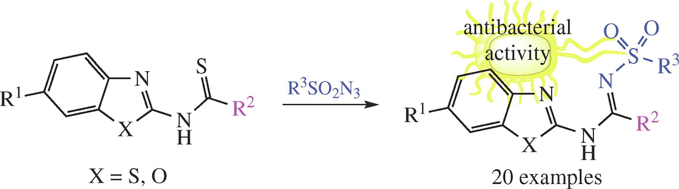 The reactions of N-(benz[d]oxazol-2-yl)- or N-(benzo[d]-thiazol-2-yl)-substituted carbothioamides with sulfonyl azides proceed as replacement of thioxo substituent by the sulfonylimino group to afford the corresponding N'-sulfonylated amidines. Acetic acid thioamides react smoothly upon boiling in ethanol, while for thioamides of trifluoroacetic and benzoic acids heating to 80–90 °C was required. Among hybrid molecules thus prepared, bacteriostatic-, bactericidal- and fungistatic-active against S. aureus and C. albicans representatives were found.