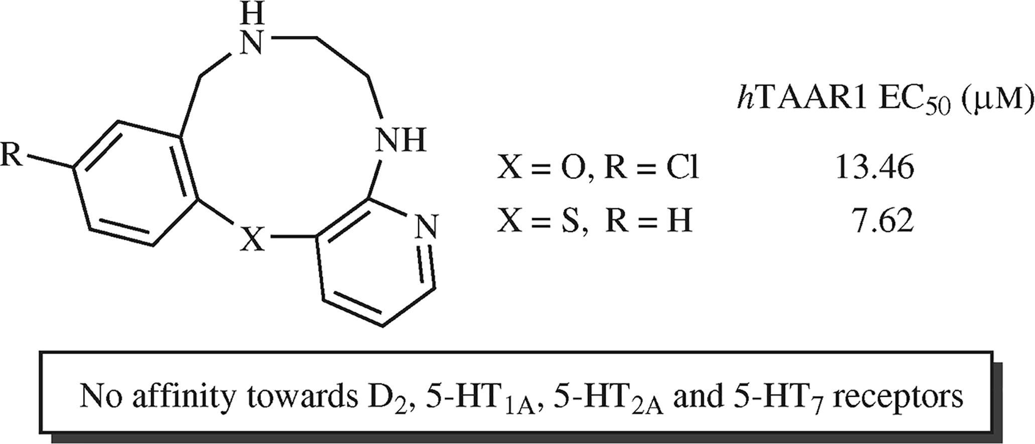 Di(het)areno-fused 1,4,7-(oxa)thiadiazecanes were synthesized by the reduction of the corresponding ten-membered lactams obtained, in turn, via the ‘hydrated imidazoline ring expansion’ (HIRE) methodology. Two of them displayed micromolar agonistic activity towards trace amine-associated receptor 1 (TAAR1) and no affinity towards a panel of dopamine (D2) and serotonin (5-HT1A, 5-HT2A and 5-HT7) receptors. These findings validate compounds of this chemotype as scaffolds for the design of selective aminergic receptor modulators.