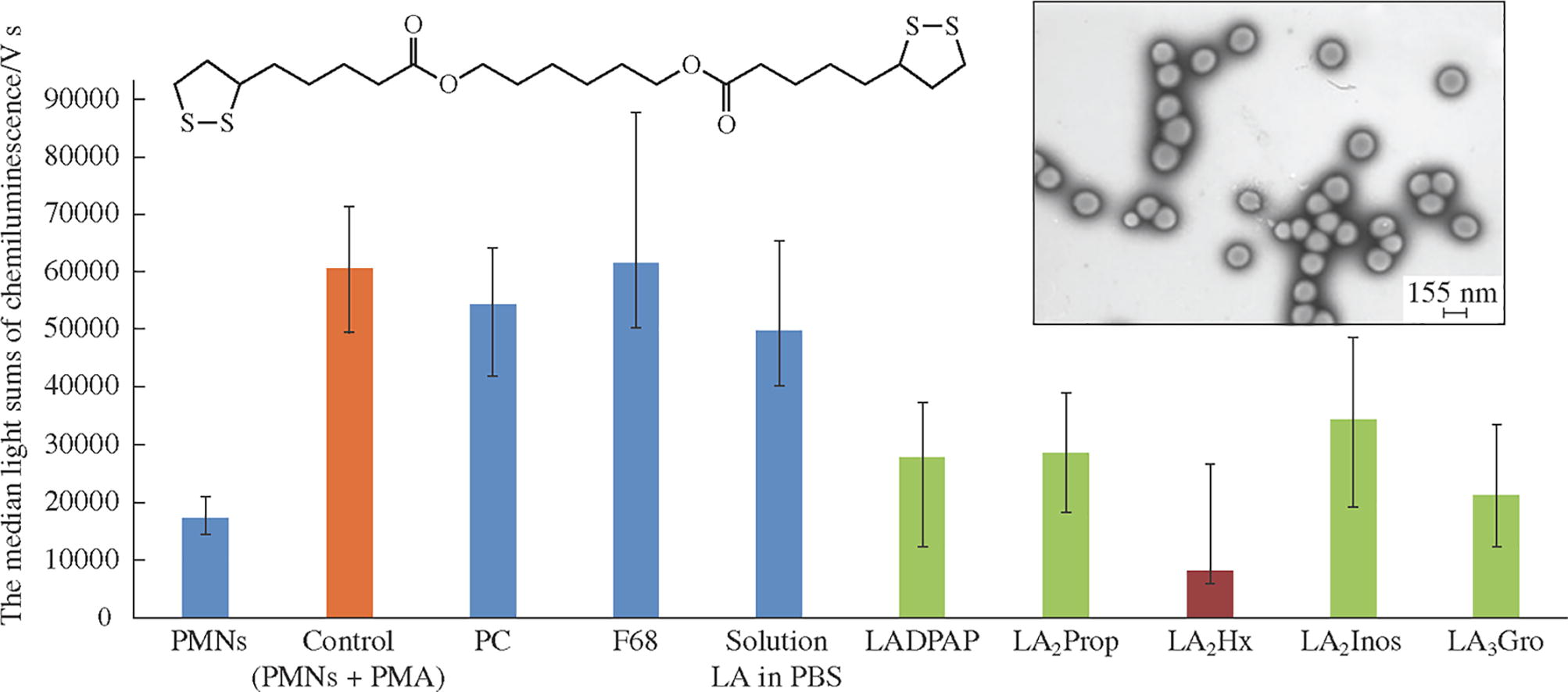 Five lipoic acid esters were synthesized, and their nanoforms based on copolymer Pluronic F68 and phosphatidylcholine were obtained. The most pronounced antioxidant effect on neutrophils activated by phorbol-12-myristate-13-acetate was shown by the nanodispersion containing the derivative of lipoic acid with hexane-1,6-diol, reducing the concentration of reactive oxygen species by 7.5 times.