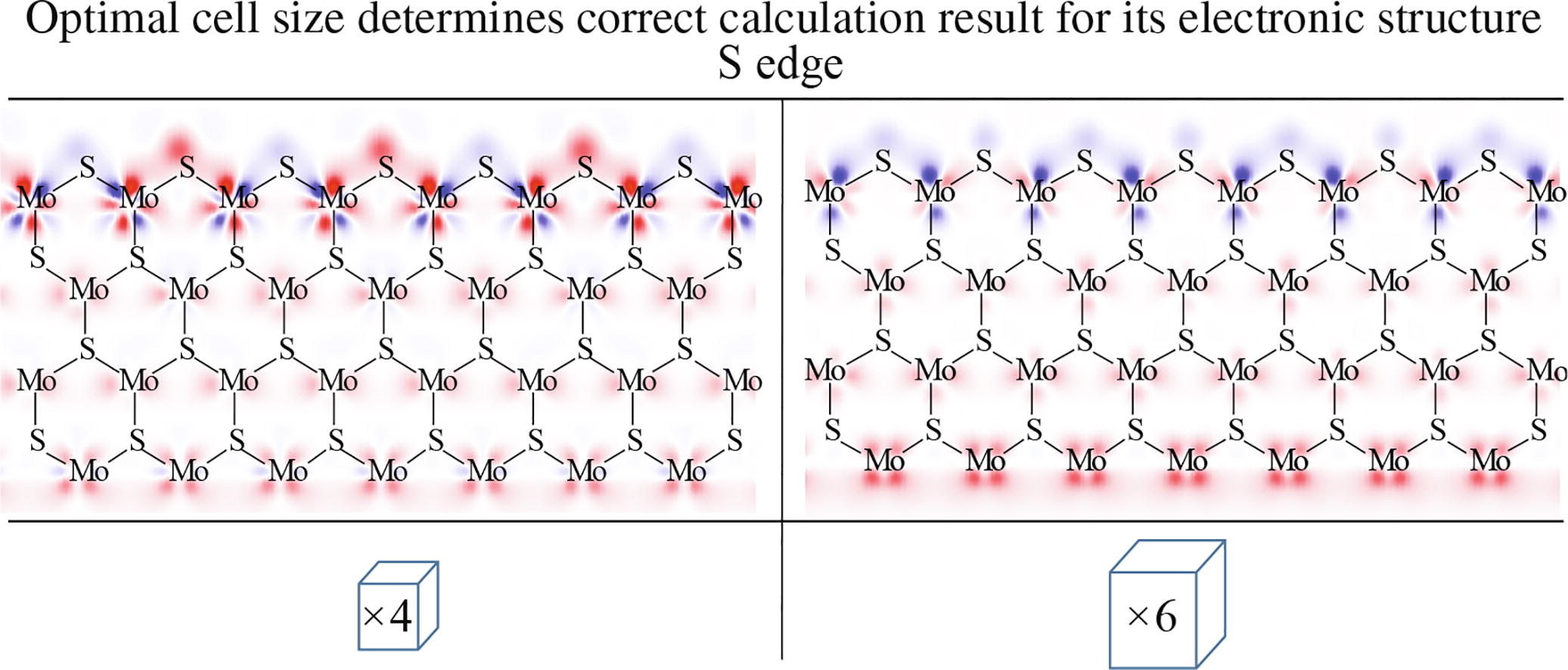 The effect of supercell size in the ribbon model of molybdenum disulfide edge on the cell electronic structure and specific energy was investigated, with and without spin polarization. The differences found were discussed in terms of electron count. Diagnostic criteria for the model applicability and the effect of opposite edge were discussed.