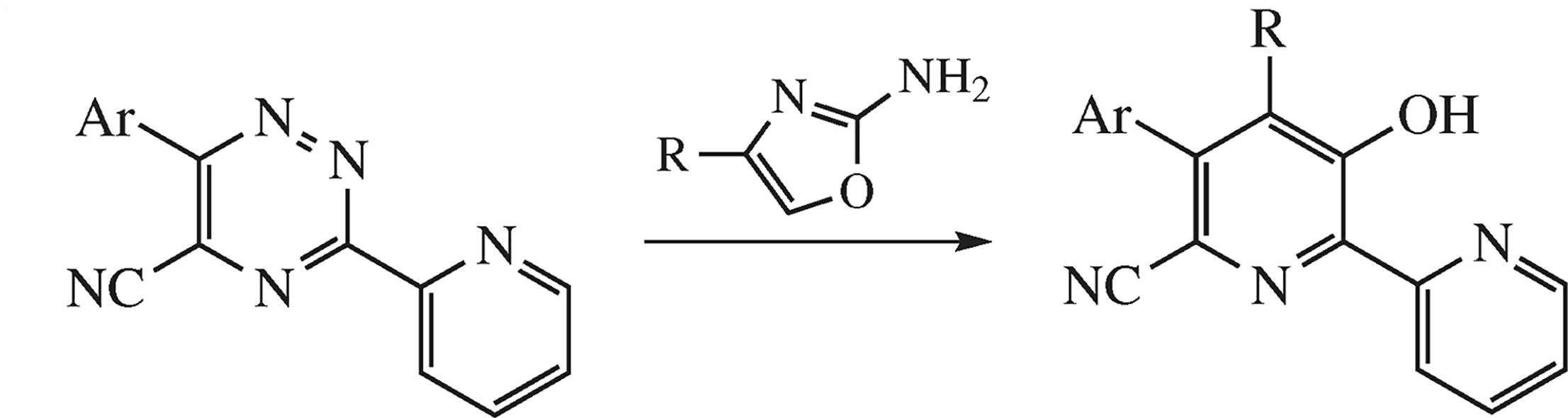 High temperature coupling of 6-aryl-5-cyano-3-(pyridin-2-yl)-1,2,4-triazines with 2-amino-4-aryloxazoles proceeds as the inverse demand Diels–Alder reaction between the oxazole moiety as dienophile and the 1,2,4-triazine moiety as diene to construct new 4,5-diaryl-6-cyano-3-hydroxypyridin-2-yl fragment. A reaction mechanism is proposed, and the structure of the key-product is proved by the X-ray diffraction analysis.