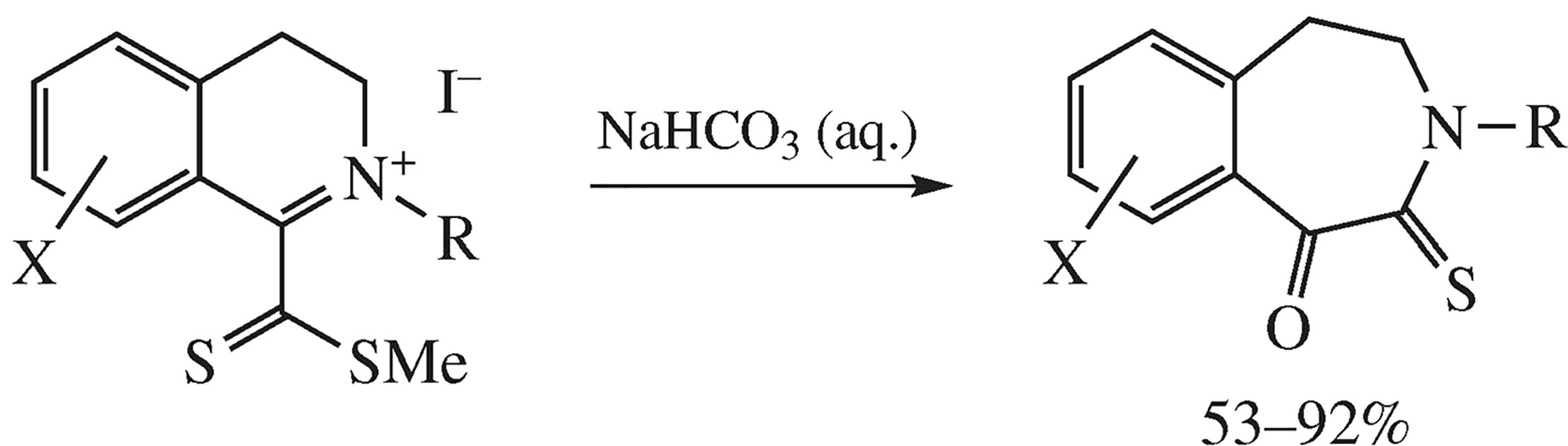 New 1-oxo-2-thioxo-1,2,4,5-tetrahydrobenz[d]azepine and 1-oxo-2-thioxo-1,2,4,5-tetrahydroazepino[4,5-b]indole derivatives were conveniently obtained by the novel recyclization reaction of (methylthio)carbonothioylsubstituted heterocyclic quaternary salts with expansion of the dihydropyridine ring.