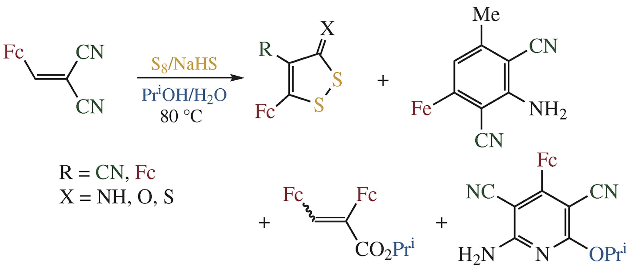 Reaction of (ferrocenylmethylidene)malononitrile with molecular sulfur and NaHS in PriOH/H2O medium gives (di)ferrocenyl-substituted 3-imino-, 3-oxo- and 3-thioxo-1,2-dithioles, ferrocenyl-substituted aminoisophthalonitrile and pyridine derivatives as well as products of fragmentation of the starting reactant. The posible mechanism for their formation is discussed.