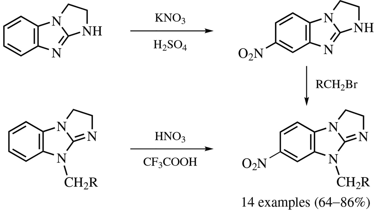 7-Nitro-2,3-dihydroimidazo[1,2-a]benzimidazole and its N9-substituted derivatives can be conveniently synthesized by nitration of the corresponding tricyclic precursors with a nitrating mixture or with the HNO3 /CF3COOH system. This reaction occurs fairly smoothly and with good regioselectivity.