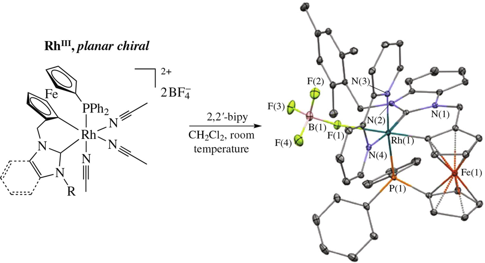 The chemical oxidation of rhodium(i) complexes [Rh(L)(COD)][BF4], where L is a ferrocenyl phosphine/N-heterocyclic carbene ligand, with 2 equiv. of a triaryl-aminium salt [(4-BrC6H4)3N][BF4] in acetonitrile gave planar chiral, air-stable [Rh(L–H)(MeCN)3][BF4]2 complexes where the ferrocene (C5H4CH2ImR or C5H4CH2BImCH2Mes) ring has been C–H activated at the position 2 in good to excellent yields. An important reactivity difference between our complexes and the ubiquitous [Cp*Rh(MeCN)3]X2 complex has been observed in the Grignard-type arylation of 4-nitrobenzaldehyde.