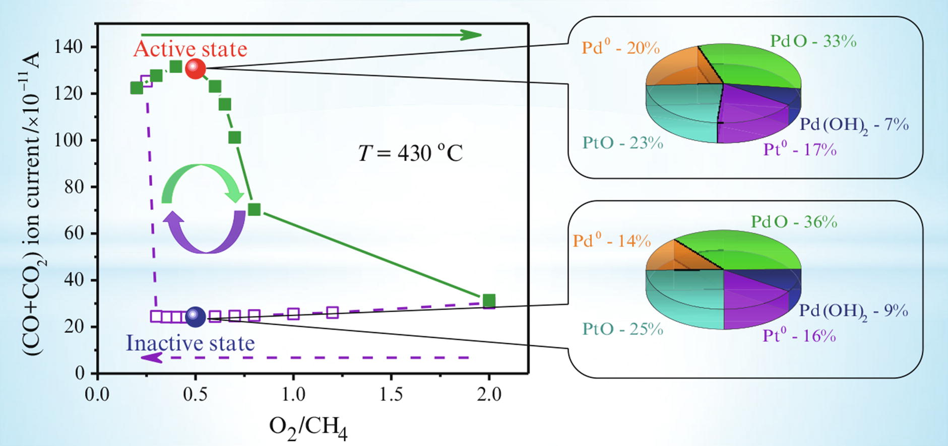 A combination of in situ XPS and mass spectrometry was used to investigate concentration hysteresis in the low- temperature oxidation of methane over a bimetallic Pt–Pd catalyst. It was shown that a decrease in the oxygen concentration leads to a sharp increase in the catalytic activity of the sample under study. The transition of the catalyst to a high/low activity state occurs due to the partial reduction/oxidation of the active component, with both platinum and palladium participating in the methane oxidation reaction.