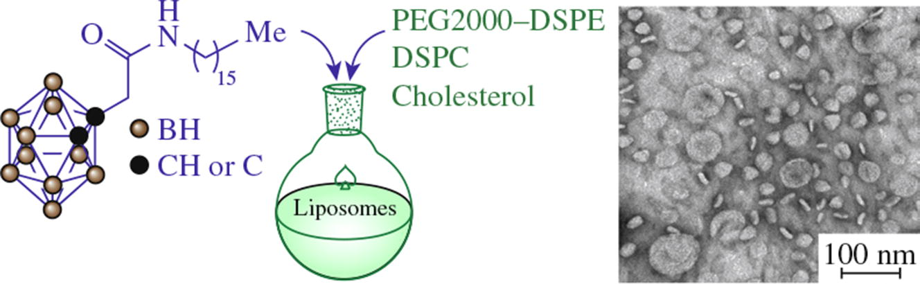 Liposomes encapsulated with lipophilic derivative of 1,2-dicarba-closo-dodecaborane have been obtained and tested for toxicity to glioblastoma U87 cells and biodistribution on a U87MG xenograft mouse model. The liposomes are able to penetrate the tumor and provide boron concentration up to 1.5 mmmmg g–1 with tumor-to-muscle ratio up to 2.4.