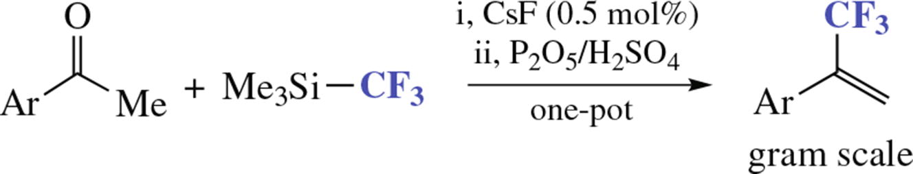 A new synthesis of α-trifluoromethylstyrenes from aromatic ketones and (trifluoromethyl) trimethylsilane is described. The reaction involves nucleophilic trifluoromethylation and elimination of trimethylsilanol, which are performed within one reaction flask.