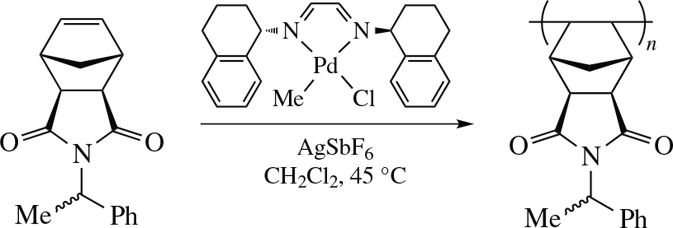 New methylpalladium chloride complex with bulky N,N'-bis(1,2,3,4-tetrahydro-1-naphthyl)-substituted glyoxal diimine ligand was obtained. This complex was found to be an efficient catalyst for vinyl-addition polymerization of norbornene derivative and for polymerization of a diazoacetate, giving polycarbenes with side polar functionalities.