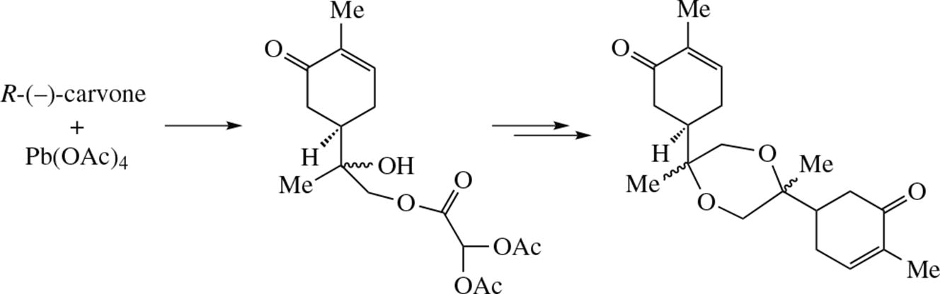 R-Carvone on heating with Pb(OAc)4 in benzene gives (2RS)-2-hydroxy-2-[(1S)-4-methyl-5-oxocyclohex-3-en-1-yl)]-prop-1-yl bis(acetoxy)acetate. Alkaline hydrolysis of this compound affords the corresponding diol which under acidic catalysis is transformed into bis-hydroxy ether and 1,4-dioxane derivatives.