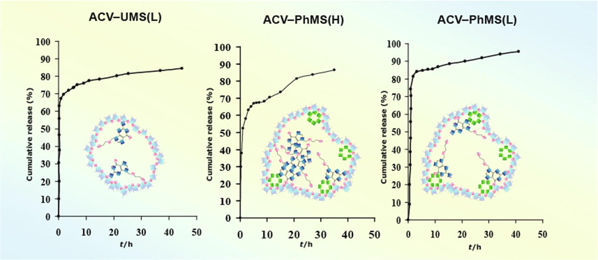 Acyclovir release from its composites with unmodified silica at pH 1.6 and 7.4 follows zero order kinetics for two days. Modification of the silica matrix with phenyl groups leads to dramatic decrease in the drug release level at pH 7.4 compared with pH 1.6 as well as to heterogeneous phase state of acyclovir in the phenyl modified composite with high loading of the drug.