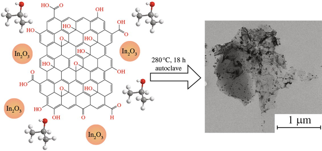 This communication describes a new method for immobilizing indium oxide nanoparticles (∼20 nm) on the surface of reduced graphene oxide. Dispersion of graphene oxide with added In2O3 nanoparticles was treated in supercritical isopropanol, both a reducing agent of graphene oxide and a reaction medium. The resulting nanocomposite was characterized by different methods of physical and chemical analysis.