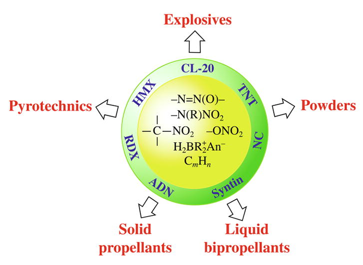Novel efficient synthetic strategies, including green methodologies, to basic and perspective high-energy density compounds, bearing active oxygen sources (C-, N- and O-nitro groups and N-oxide fragments) and high-enthalpy polynitrogen heterocycles, are briefly overviewed. Recently developed synthetic approaches to nitro group-free hypergolic ionic liquids (HILs) and strained 1,5-diaza- bicyclo[3.1.0]hexane derivatives capable of ultrafast ignition upon mixing with an oxidizer, and to high-energy liquid hydrocarbons with strained cyclopropane fragments are also considered. Physicochemical properties, energetic performances and potential applications of energetic compounds and composites as key components of explosives, powders and solid or liquid rocket propellants are critically discussed with a focus on original reports published in the period 2016–2021.